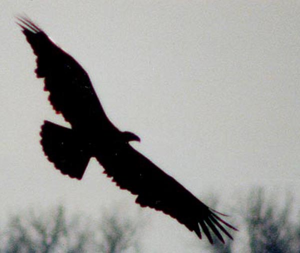 A BALD EAGLE SOARING HIGH OVER THE MISSISSIPPI RIVER ALONG THE