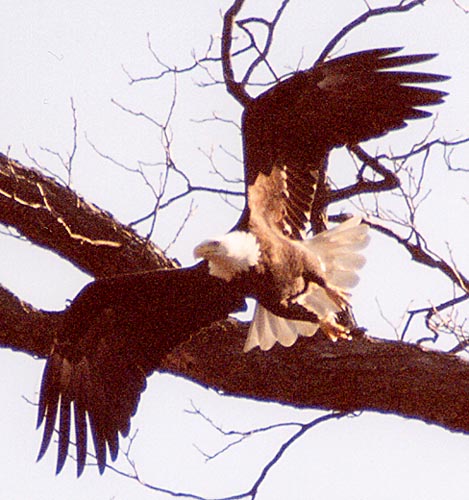 A BALD EAGLE LEAVES ITS PERCH ALONG THE ILLINOIS RIVER NEAR THE BRUSSELS FERRY