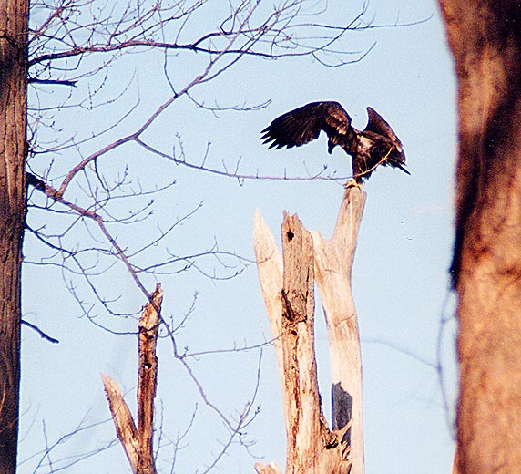 A "BALANCING ACT" IS REQUIRED FOR THIS JUVENILE BALD EAGLE TO RETURN TO ITS PERCH