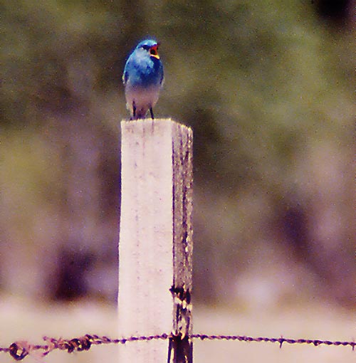 MOUNTAIN BLUEBIRD "SINGS OUT" NEAR THE NORTH ENTRANCE OF YELLOWSTONE NATIONAL PARK