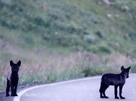 PUPS FROM THE DRUID PEAK PACK VENTURE DOWN FROM THE DEN FOREST IN EARLY JULY, 2000, AND SEEM TO BE "LOOKING BOTH WAYS" BEFORE CROSSING.