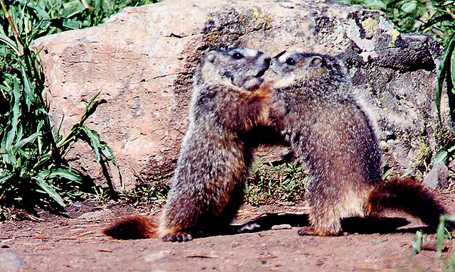 "WRESTLING MATCHES" ARE A DAILY OCCURRENCE AT SHEEPEATER CLIFFS . . . PROBABLY PROVOKED BY ONE MARMOT REFERRING TO THE OTHER AS A "YELLOW-BELLY"